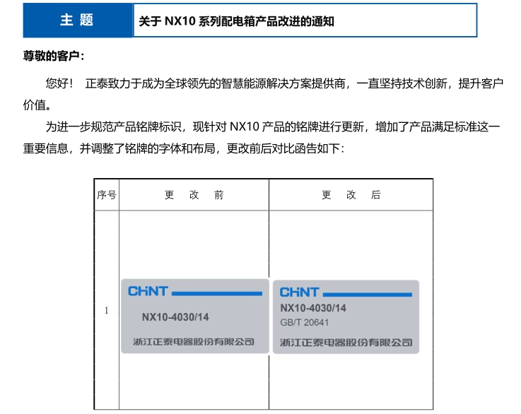 關(guān)于 NX10 系列配電箱產(chǎn)品改進的通知