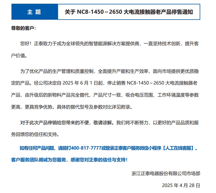 關(guān)于 NC8-1450~2650 大電流接觸器老產(chǎn)品停售通知