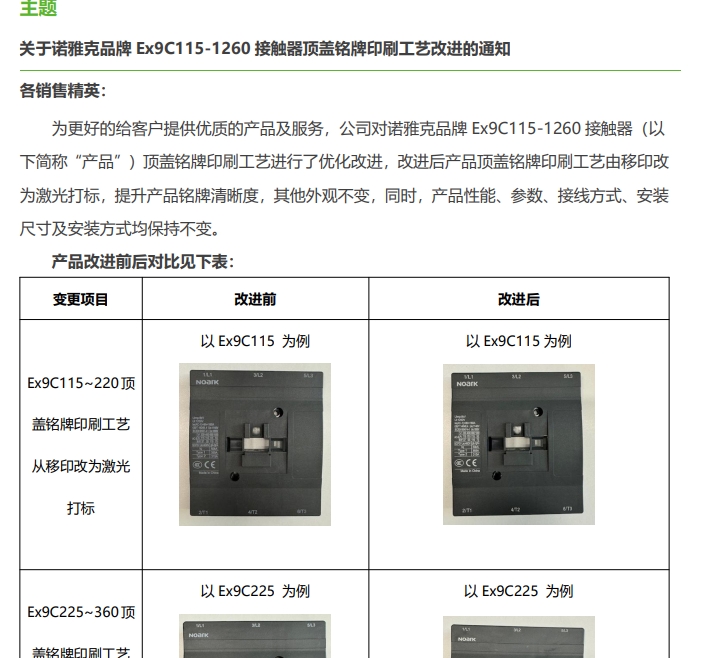關(guān)于諾雅克品牌 Ex9C115-1260 接觸器頂蓋銘牌印刷工藝改進(jìn)的通知