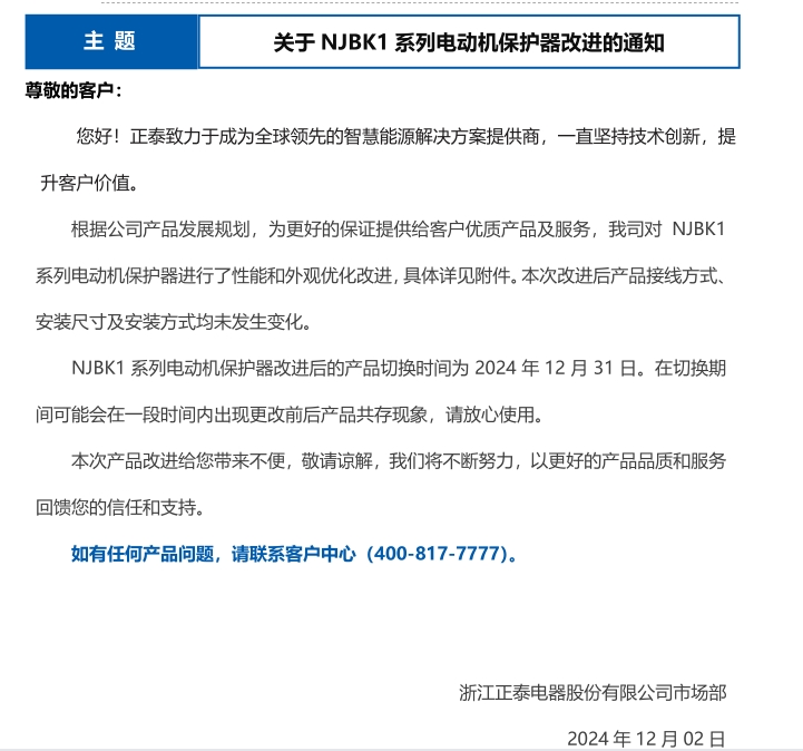 關(guān)于 NJBK1 系列電動(dòng)機(jī)保護(hù)器改進(jìn)的通知