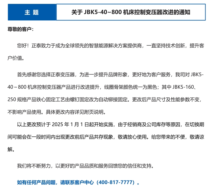 關(guān)于 JBK5-40~800 機(jī)床控制變壓器改進(jìn)的通知