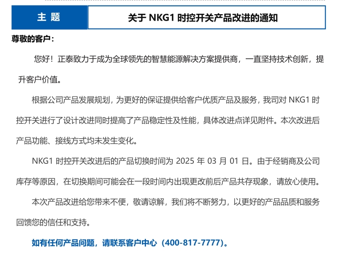 關(guān)于 NKG1 時(shí)控開(kāi)關(guān)產(chǎn)品改進(jìn)的通知