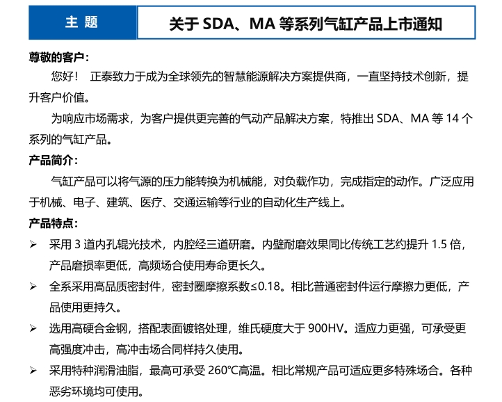 關(guān)于 SDA、MA 等系列氣缸產(chǎn)品上市通知