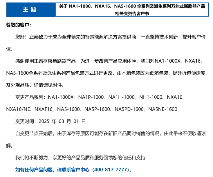 關于 NA1-1000、NXA16、NA5-1600 全系列及派生系列萬能式斷路器產品 相關變更告客戶書