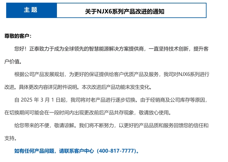 關(guān)于NJX6系列產(chǎn)品改進(jìn)的通知