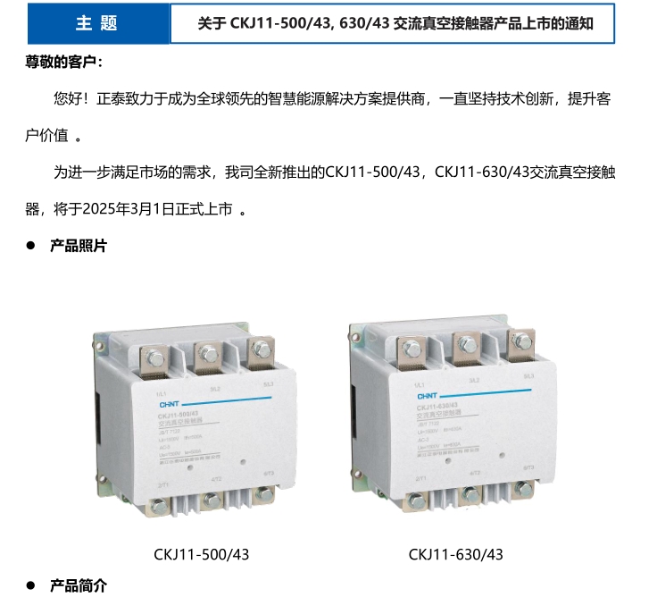關(guān)于 CKJ11-500/43, 630/43 交流真空接觸器產(chǎn)品上市的通知