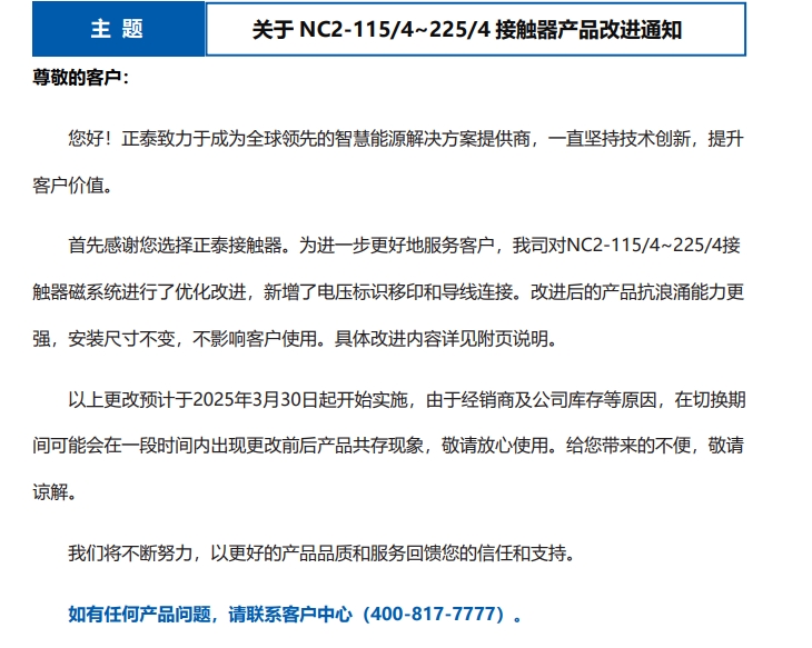 關(guān)于 NC2-115/4~225/4 接觸器產(chǎn)品改進(jìn)通知