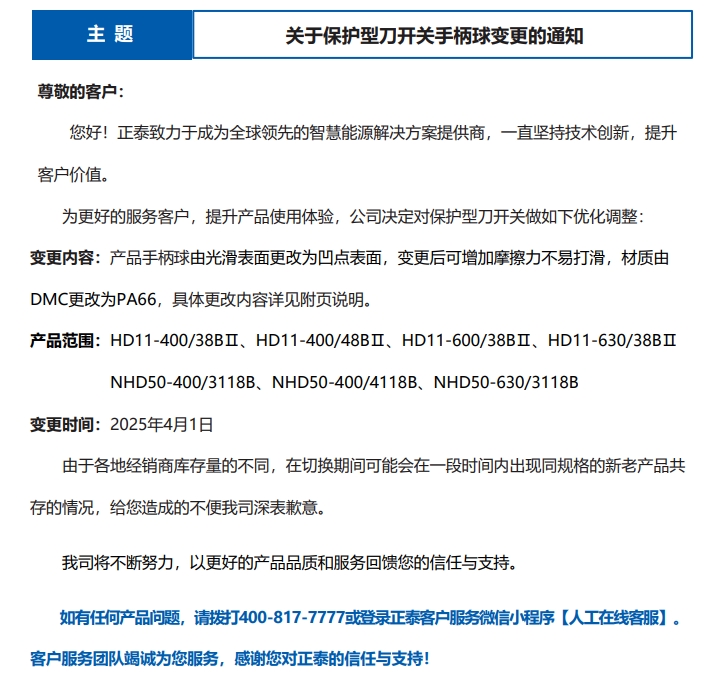 關(guān)于 HD11-100~400A 保護(hù)型刀開關(guān)變更的通知