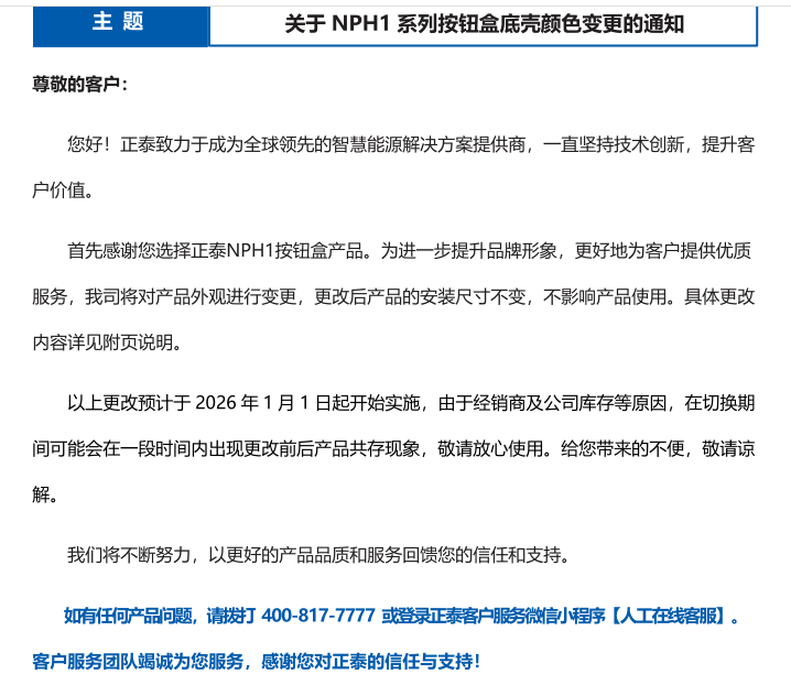 關(guān)于 NPH1 系列按鈕盒底殼顏色變更的通知