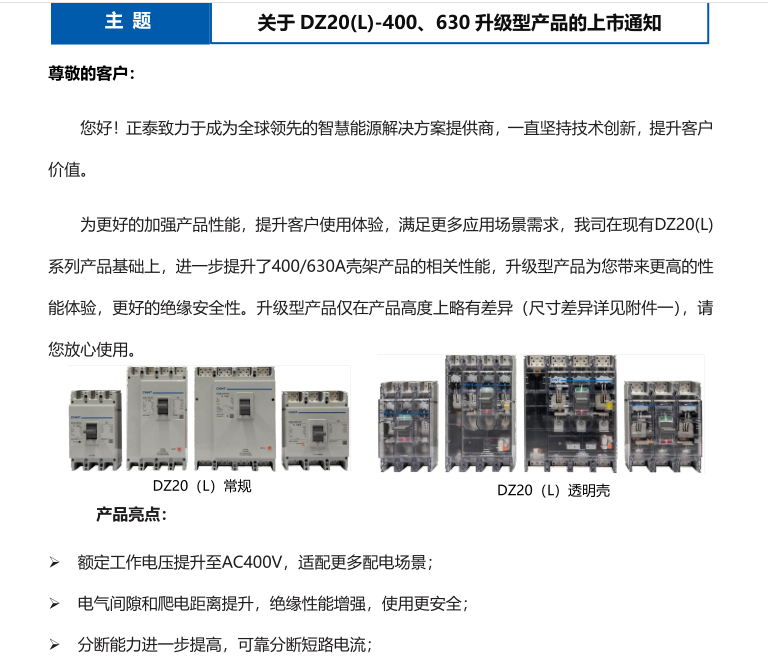 關(guān)于 DZ20(L)-400、630 升級(jí)型產(chǎn)品的上市通知