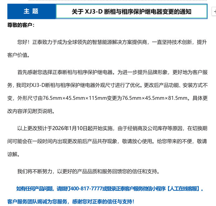 關(guān)于 XJ3-D 斷相與相序保護(hù)繼電器變更的通知
