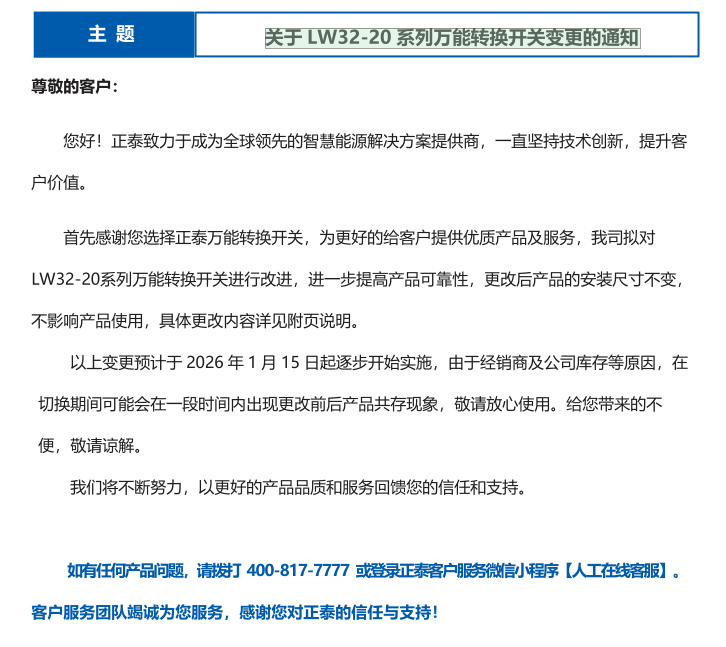關(guān)于 LW32-20 系列萬(wàn)能轉(zhuǎn)換開(kāi)關(guān)變更的通知