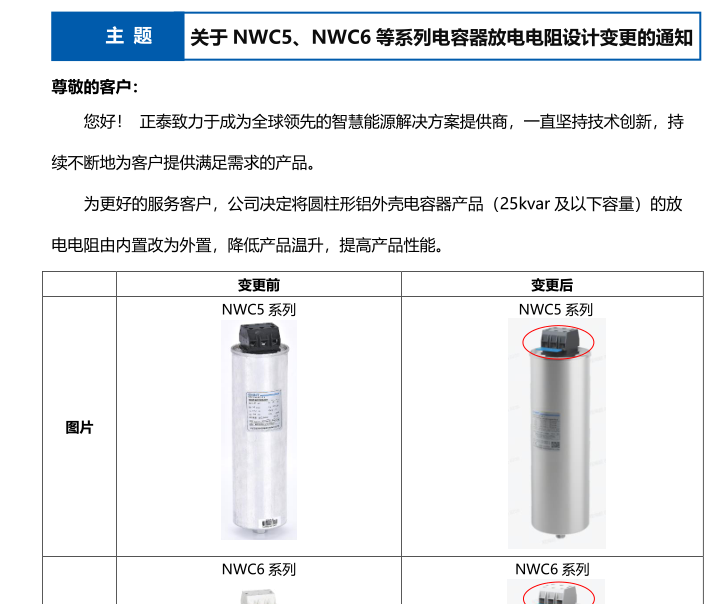 關(guān)于 NWC5、NWC6 等系列電容器放電電阻設(shè)計(jì)變更的通知
